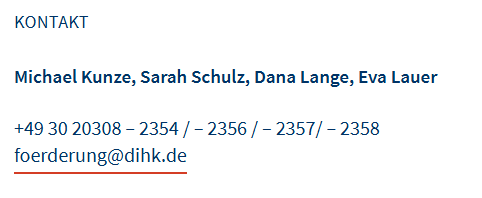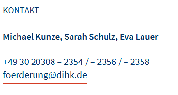 Die Leitstelle für Gewerbefördermittel des Bundes bei der DIHK Service GmbH führt das Programm im Auftrag des Bundesamtes für Wirtschaft und Ausfuhrkontrolle (BAFA) durch. Vor Ort können Sie sich bei Ihrer Industrie- und Handelskammer und weiteren Regionalpartnern über die Förderung informieren.